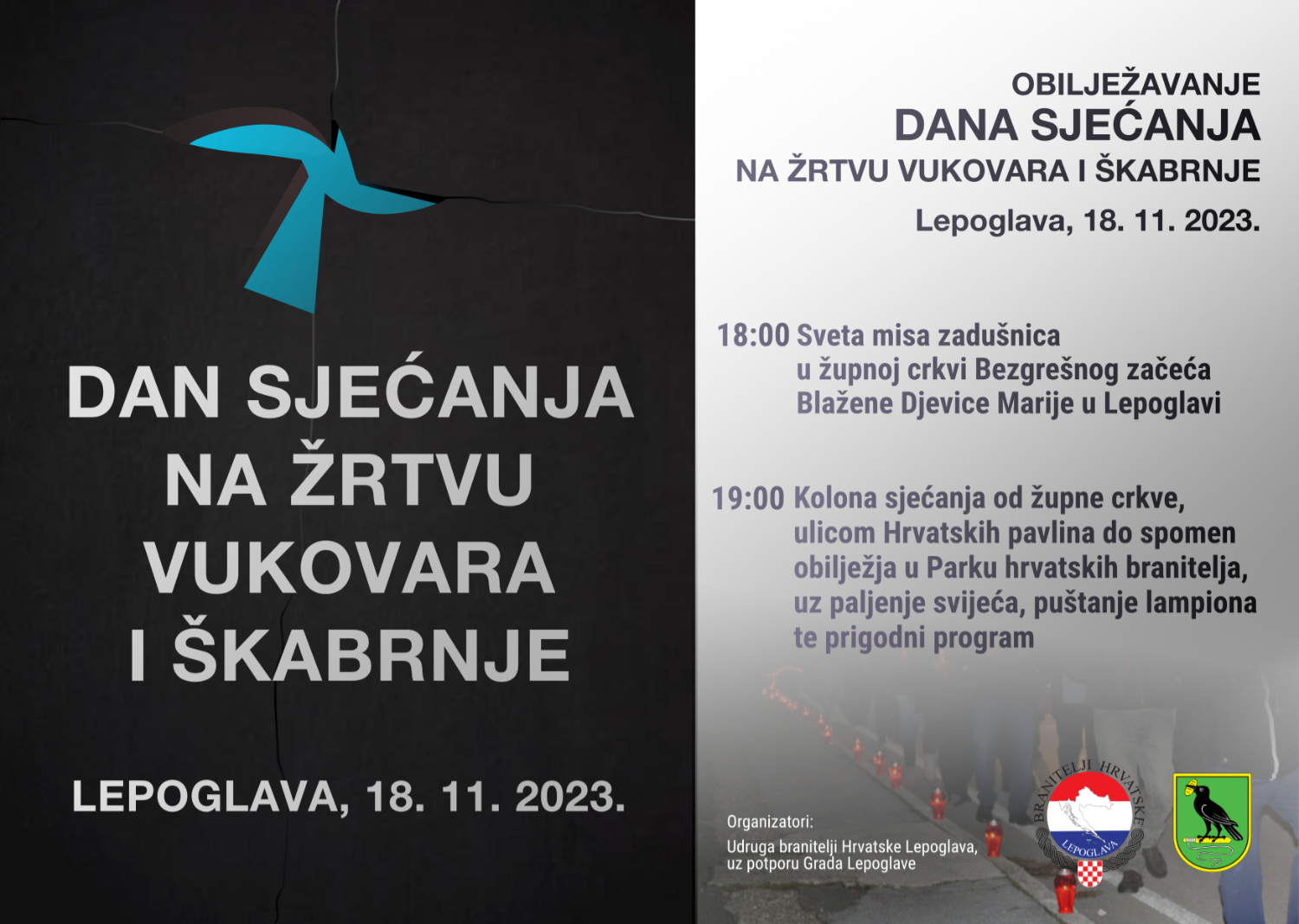 Dan sjećanja na žrtve Domovinskog rata i Dan sjećanja na žrtvu Vukovara i Škabrnje obilježit će se 18. studenog u Lepoglavi. U 18 sati, u župnoj crkvi Bezgrešnog začeća Blažene Djevice Marije u Lepoglavi, bit će služena misa zadušnica za žrtve Domovinskog rata. Nakon mise, od 19 sati, počast žrtvama bit će odana kolonom sjećanja koja će krenuti od župne crkve te, uz paljenje svijeća, prolaziti ulicom Hrvatskih pavlina do spomen obilježja u Parku hrvatskih branitelja gdje će uz počast žrtvama biti odana uz prigodan program i puštanje lampiona.