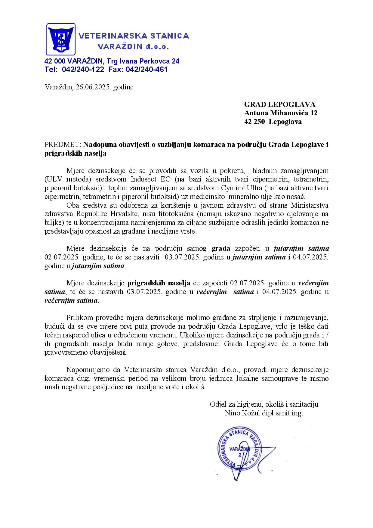 Iz Veterinarske stanice Varaždin obavještavaju stanovnike na području Lepoglave i prigradskih naselja da će od 2. do 4. srpnja biti provedena dezinsekcija odnosno suzbijanje komaraca.