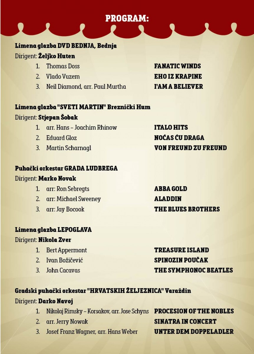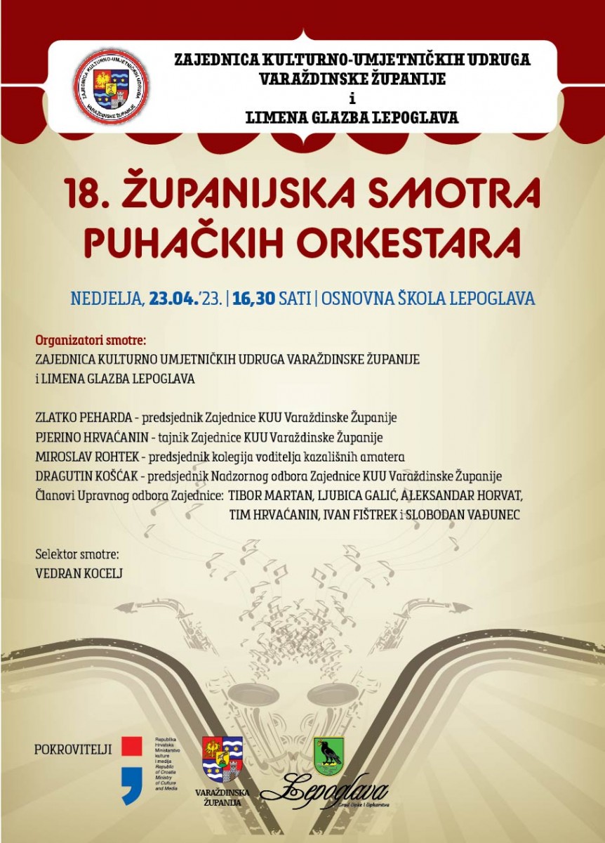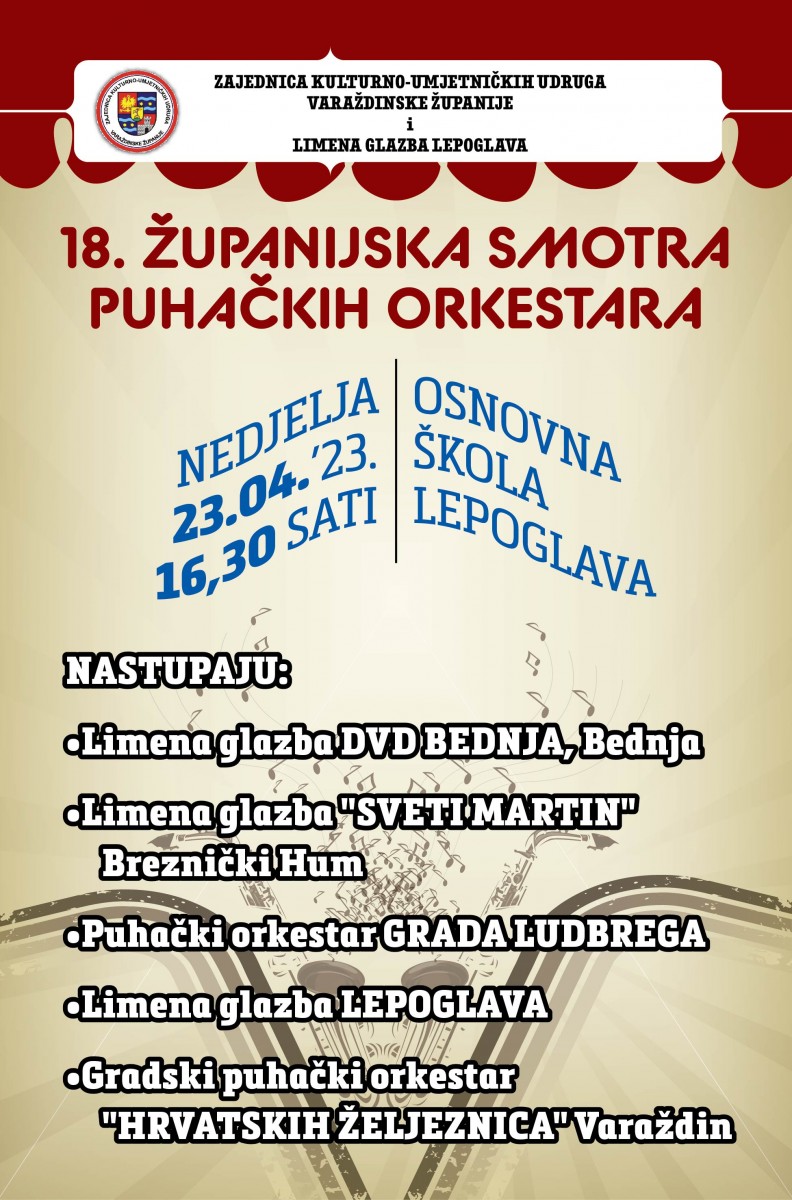 18. Smotra puhačkih orkestara Varaždinske Županije održat će se u Gradu Lepoglavi ovu nedjelju 23. travnja 2023. godine s početkom u 16:30 u OŠ Lepoglava. Pobjednici smotre će nas predstavljati na ovogodišnjim 36. državnim susretima puhačkih orkestara u Opatiji, a selektor smotre je g. Vedran Kocelj. Smotru organiziraju Zajednica kulturno umjetničkih udruga Varaždinske Županije i Limena glazba Lepoglava,uz pokroviteljstvo Ministarstva kulture RH, Varaždinske Županije i Grada Lepoglave.